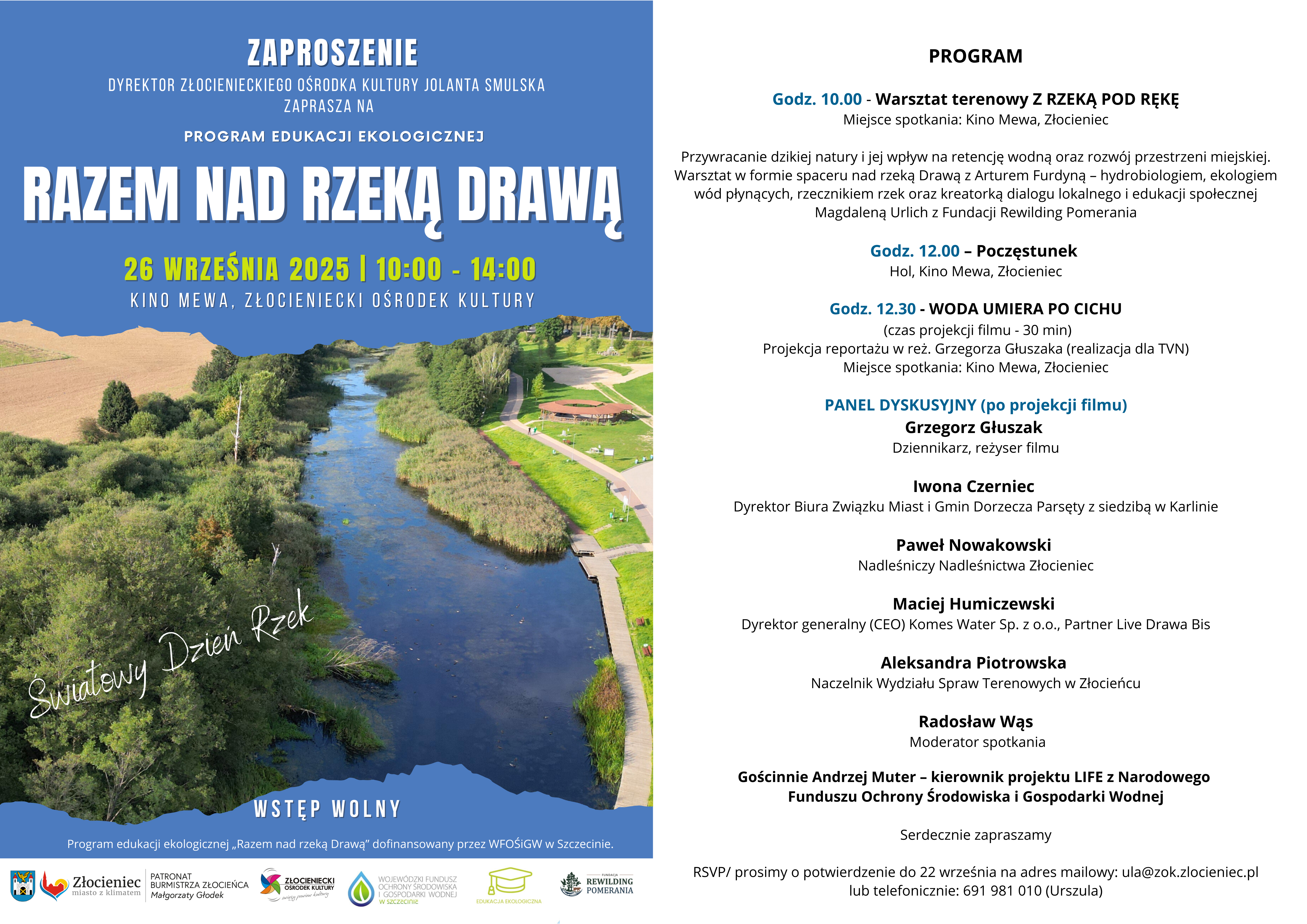 w imieniu Złocienieckiego Ośrodka Kultury mamy zaszczyt zaprosić Państwa na Program Edukacji Ekologicznej "Razem nad rzeką Drawą", w ramach którego odbędą się warsztaty, projekcja reportażu "Woda umiera po cichu" oraz panel dyskusyjny.