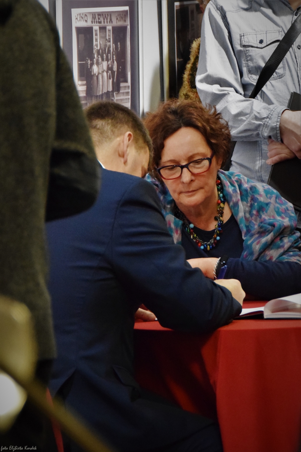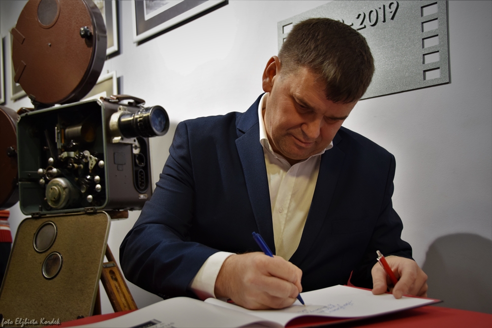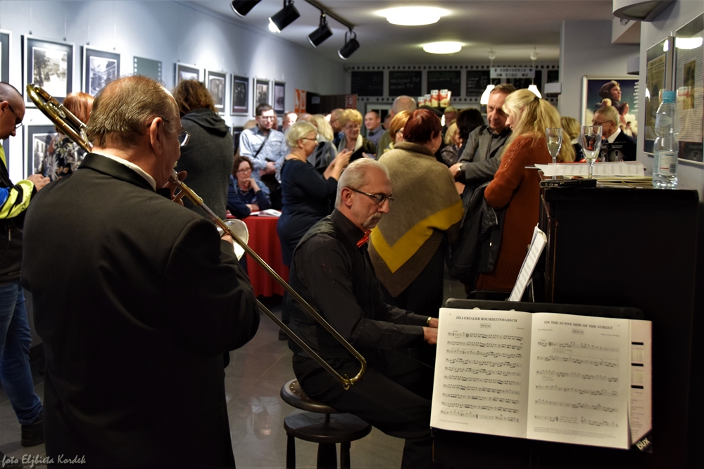 Po spotkaniu, w naszym holu kinowym ustawiła się długa kolejka do autora - każdy chciał mieć jego autograf, porozmawiać o historii, podzielić się swoimi wrażeniami. We wspaniały nastrój kina z dawnych lat wprowadził nas pan Antoni Gadzina grający na pianinie w asyście puzonisty. Nie zabrakło też lampki szampana - w końcu stulecia nie obchodzi się co roku ;)