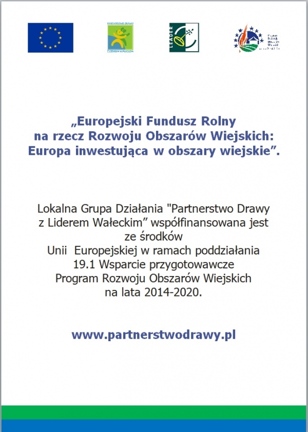 Lokalna Grupa Działania "Partnerstwo Drawy z Liderem Wałeckim” współfinansowana jest ze środków Unii Europejskiej w ramach poddziałania 19.1 Wsparcie przygotowawcze Program Rozwoju Obszarów Wiejskich na lata 2014-2020.